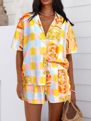 Womens 2 Piece Summer Beach Outfits Printed Short Sleeve Tops Lounge Shorts Casual Tracksuit Set