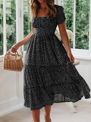 Saonta Dresses for Women 2023 Wedding Guest Summer V Neck Short Sleeve Smocked Ruffle Hem A-Line Polka Dot Boho Maxi Dress