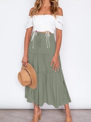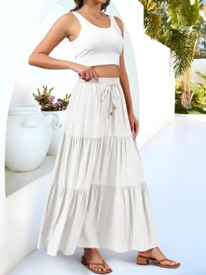 Saonta Women’s 2024 Summer Elastic High Waist Boho Maxi Skirt Casual Drawstring A Line Flowy Long Skirts