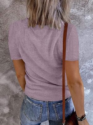 Women’s Short Saonta V Neck Ribbed Knit Button T Shirts Henley Solid Color Summer Tops